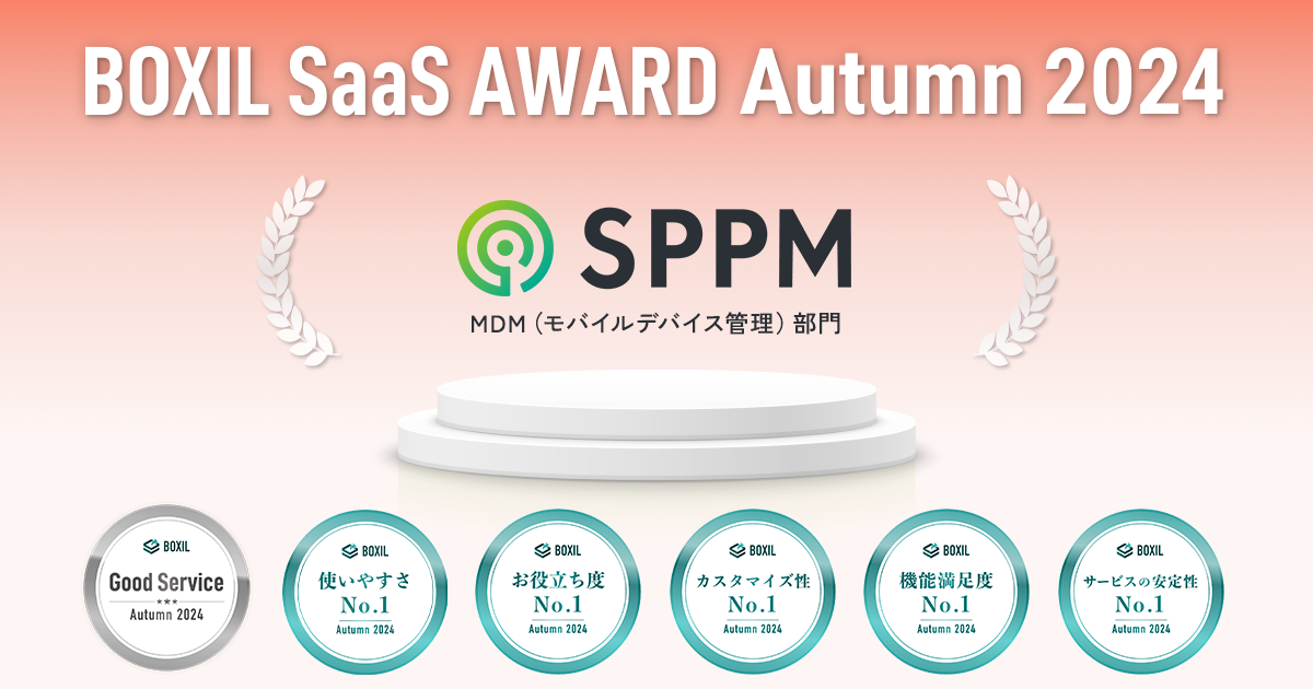 SPPM3.0は、スマートキャンプ株式会社(以下「スマートキャンプ」)が主催する「BOXIL SaaS AWARD Autumn 2024」のMDM(モバイルデバイス管理)部門で「Good Service」および「使いやすさNo.1」「お役立ち度No.1」「カスタマイズ性No.1」「機能満足度No.1」「サービスの安定性No.1」に選出されました。